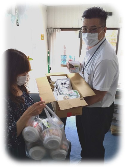 食品や、手作りマスク、レタス、牛丼セット等も一緒にお渡ししました